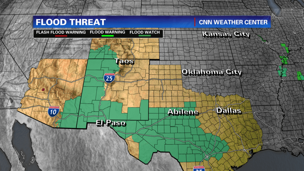 The National Weather Service has outlined flash flood watches throughout most of central Texas and into areas of the Four Corners. In the next 24 hours, 2 to 4 inches of rain are expected in central Texas, with 1 to 2 inches northeast into the Four Corners region.